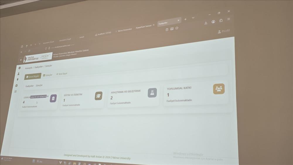 Daha önce gerçekleştirilen tanıtım toplantılarının devamı ve tamamlayıcısı niteliğinde olan toplantıda, Yalova Üniversitesi Modüler Yönetim Sistemi kapsamlı biçimde ele alındı. Sunum sürecinde kalite ekibi üyelerinden sistemin işleyişine ilişkin geri bildirimler alınarak, uygulamaya dönük değerlendirmeler yapıldı.
