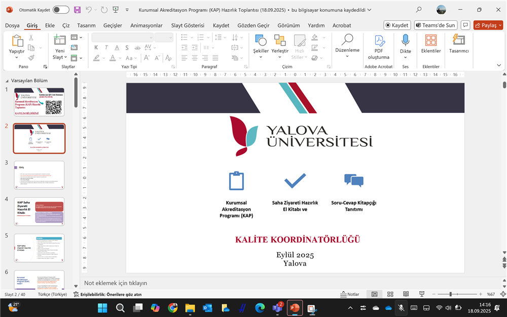 25 Eylül 2025 tarihinde Yalova Üniversitesi’nde kalite temsilcisi öğrenciler için Kurumsal Akreditasyon Programı (KAP) bilgilendirme toplantısı çevrim içi olarak gerçekleştirildi. Üniversitemizdeki tüm bölüm ve programların kalite temsilcisi öğrencilerinin katıldığı toplantı, Rektör Prof. Dr. Mehmet Bahçekapılı’nın açılış konuşmasıyla başladı.