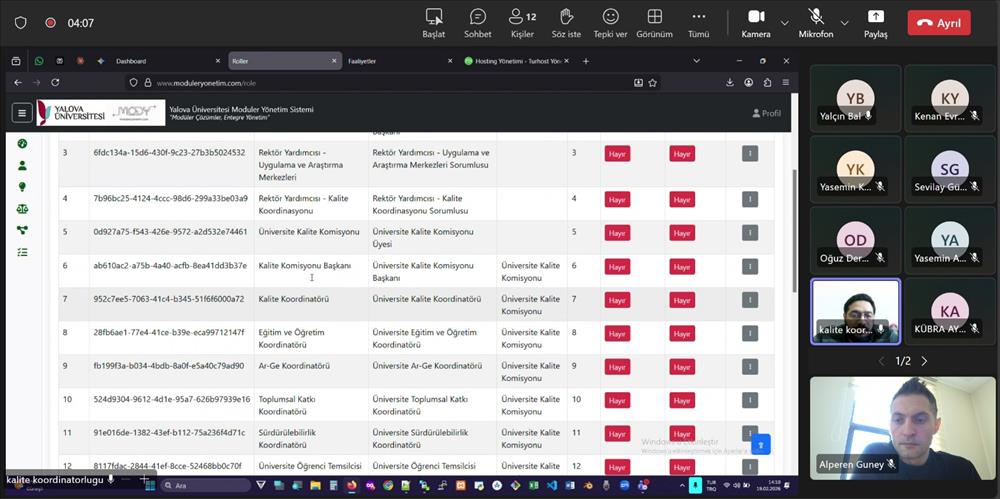 Toplantıda, Öğr. Gör. Halil Arslan tarafından Yalova Üniversitesi Modüler Yönetim Sistemine ilişkin sunum gerçekleştirildi. Sunum sürecinde kalite ekibi üyelerinden sistemin işleyişine yönelik geri bildirimler alınarak, uygulamaya dönük değerlendirmeler yapıldı.