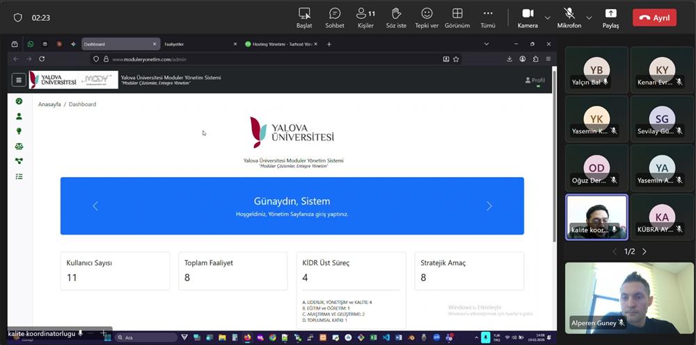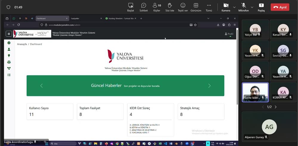 Yalova Üniversitesi Kalite Koordinatörlüğü tarafından, Stratejik Plan (SP) ve PUKÖ (Planla–Uygula–Kontrol Et–Önlem Al) döngüsünün dijital ortamda etkin şekilde yürütülmesini amaçlayan yazılıma yönelik dördüncü tanıtım toplantısı, 19.02.2026 tarihinde saat 14.00’te çevrim içi olarak gerçekleştirildi. Toplantı, Kaliteden Sorumlu Rektör Yardımcısı Prof. Dr. Senay Yürür Karslıoğlu başkanlığında yapıldı.