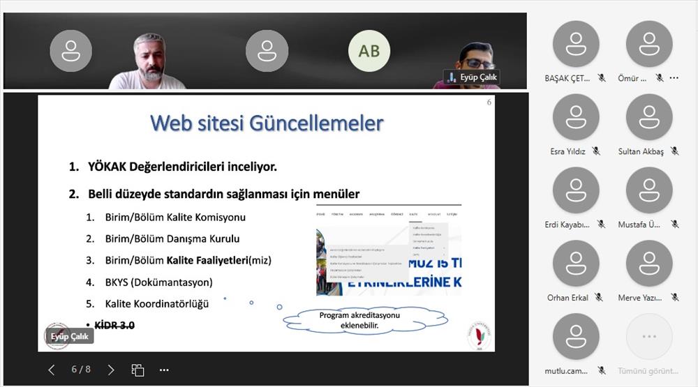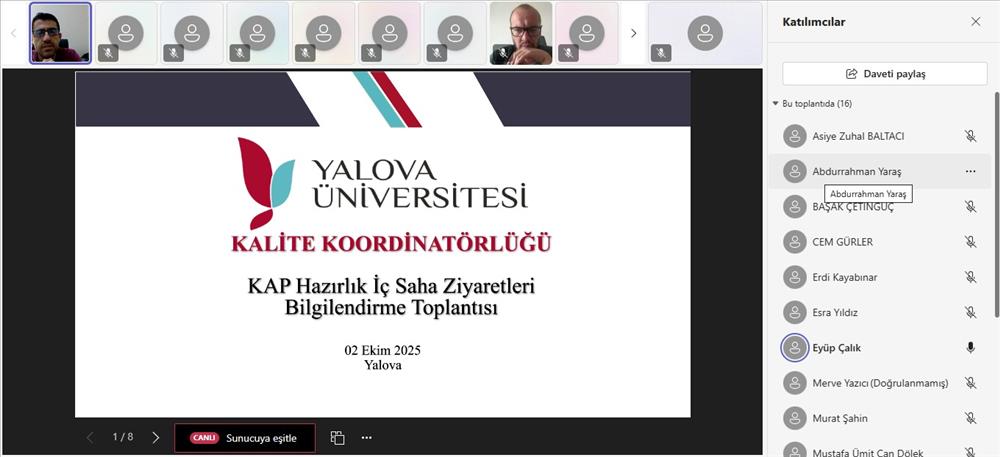 Yalova Üniversitesi’nde Kurumsal Akreditasyon Programı (KAP) denetim süreci öncesinde hazırlık çalışmaları hız kazandı. Bu kapsamda Kalite Koordinatörü Doç. Dr. Eyüp Çalık başkanlığında birim kalite koordinatörleri 02.10.2025 tarihinde ile çevrimiçi bilgilendirme toplantısı gerçekleştirildi.